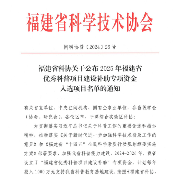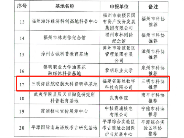 11月,福建省科學(xué)技術(shù)協(xié)會(huì)公布了2025年福建省優(yōu)秀科普項(xiàng)目建設(shè)補(bǔ)助專項(xiàng)資金入選項(xiàng)目名單。海絲科技申報(bào)的“三明海絲航空航天科普研學(xué)基地”入選,是我市唯一獲選企業(yè)。